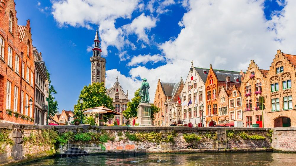 City view of Brugge canal Spiegelrei, Bruges, Flanders, Belgium.
